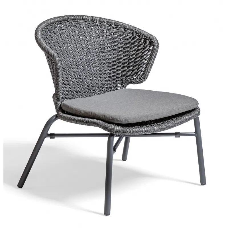 Ogrodje fotelja je iz aluminija, sedišče in naslon pa sta prepletena z ročno tkano sintetičo vrvjo.