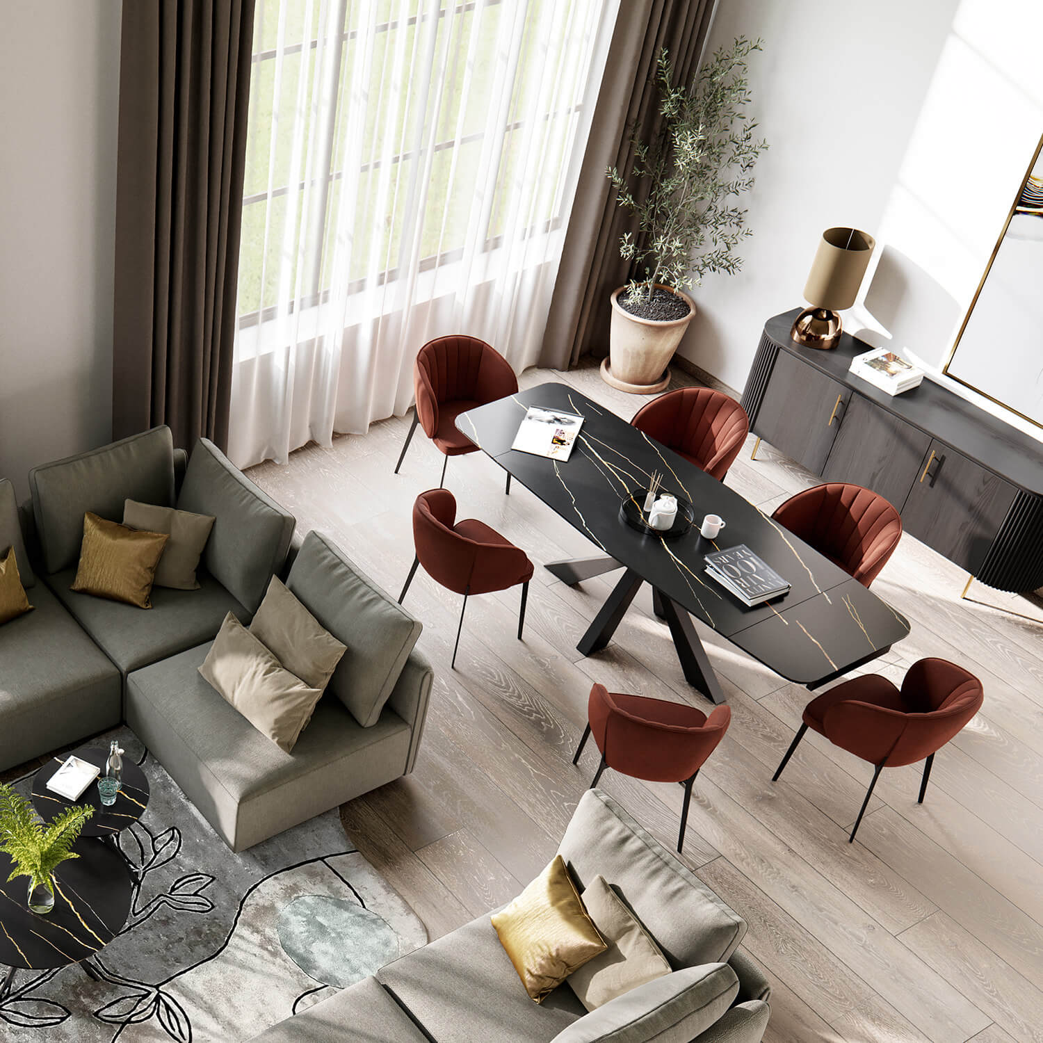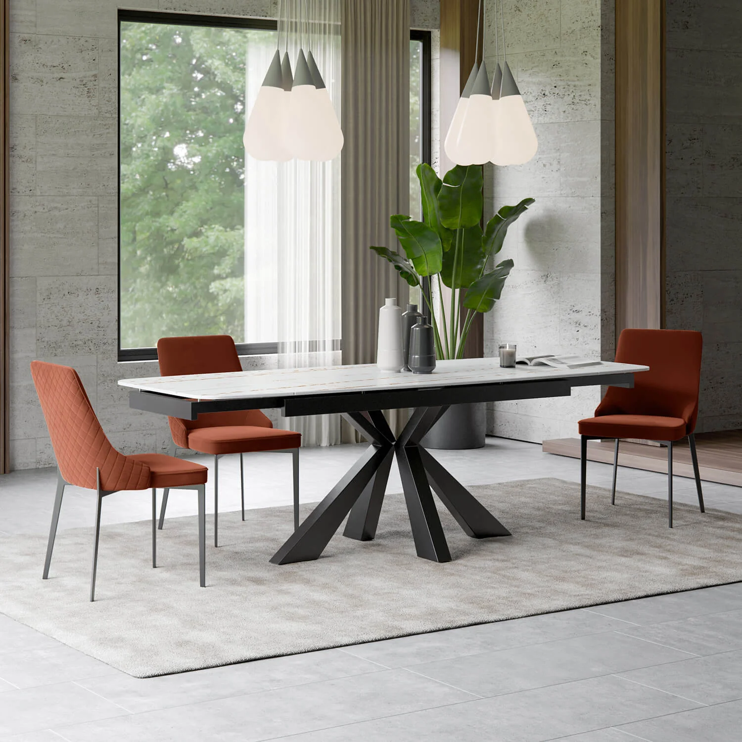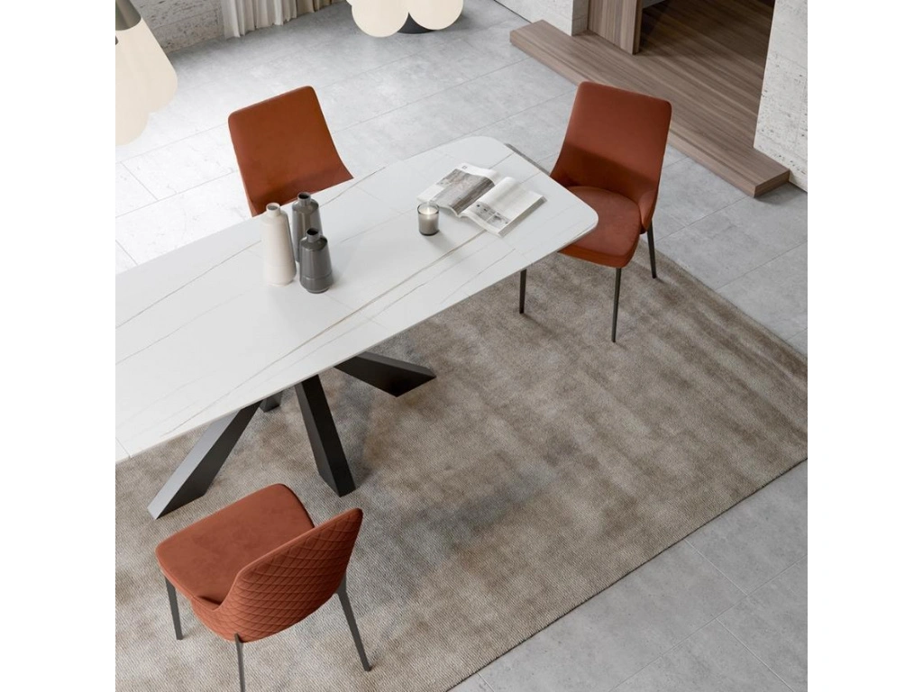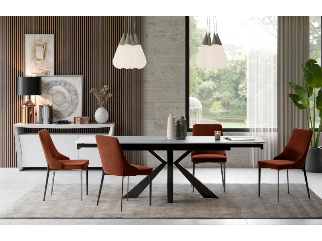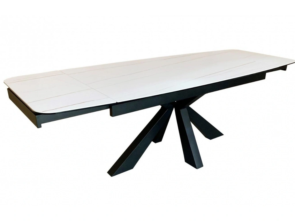 Raztegljiva jedilna miza BOENA ima mizno ploščo iz keramike lorin (5mm) in ploščo kaljenega stekla (8mm) spodaj.