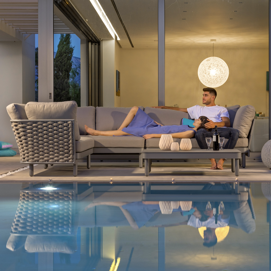 Zunanjo garnituro Laos sestavljajo tri dvojni elementi, en enojni element, tabure ter mizica.